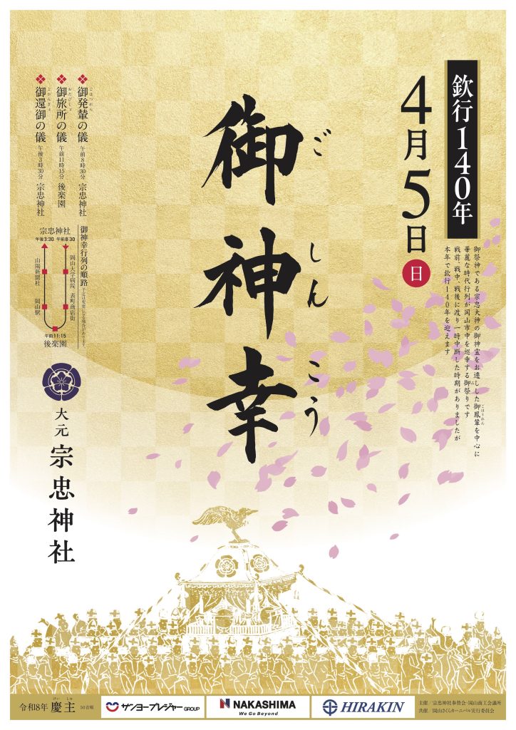 この行列は御鳳輦を中心に300人余、0.5キロにわたる絢爛華麗な時代絵巻を繰り広げ、各地の奉賛民芸陣の参加もあり、岡山の春を彩る行事として親しまれています。